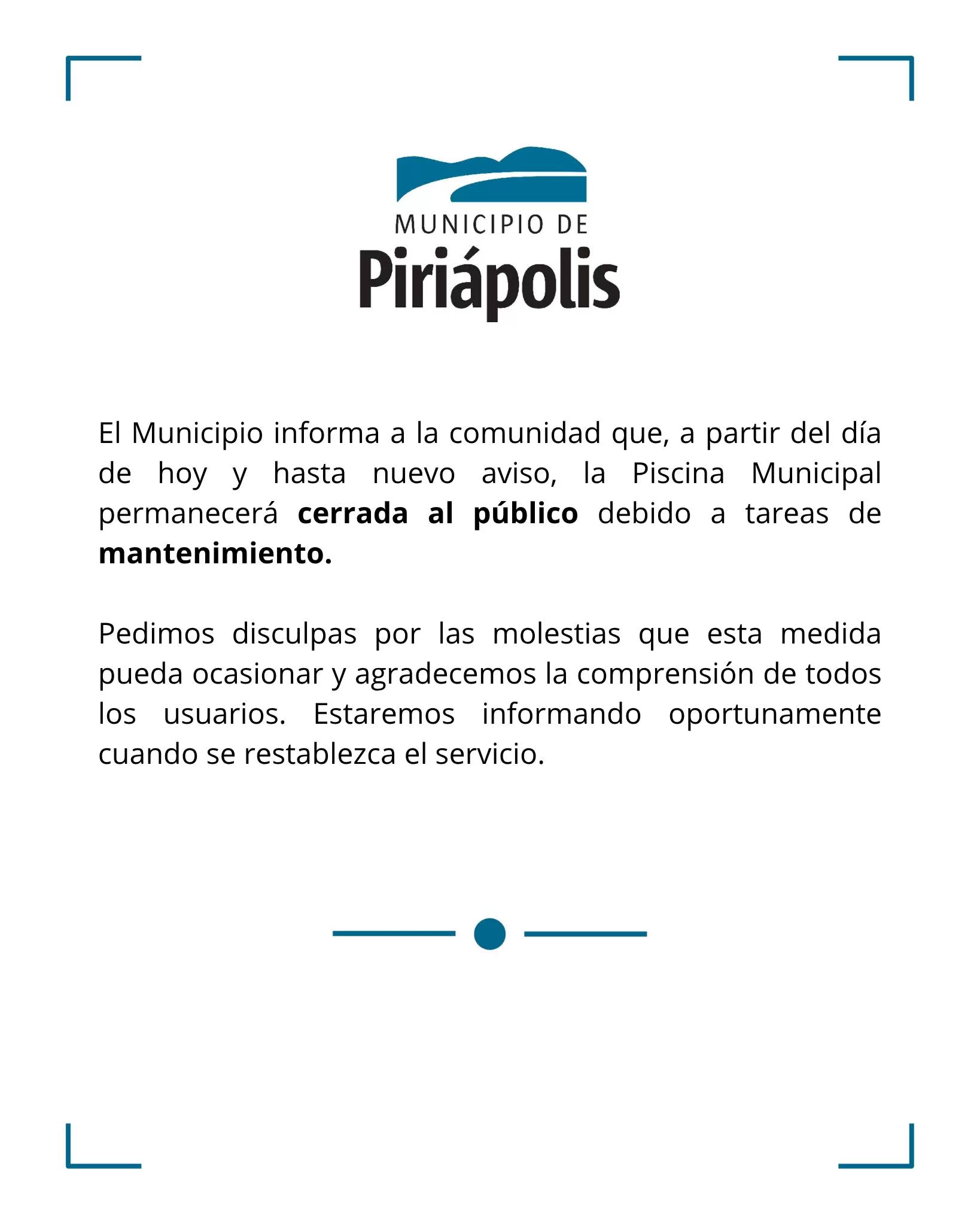 El Municipio de Piriápolis comunica a los vecinos que la Piscina Municipal permanecerá cerrada al público hasta nuevo aviso. La medida se debe a la realización de diversas tareas de mantenimiento necesarias para garantizar el correcto funcionamiento y la seguridad de las instalaciones.