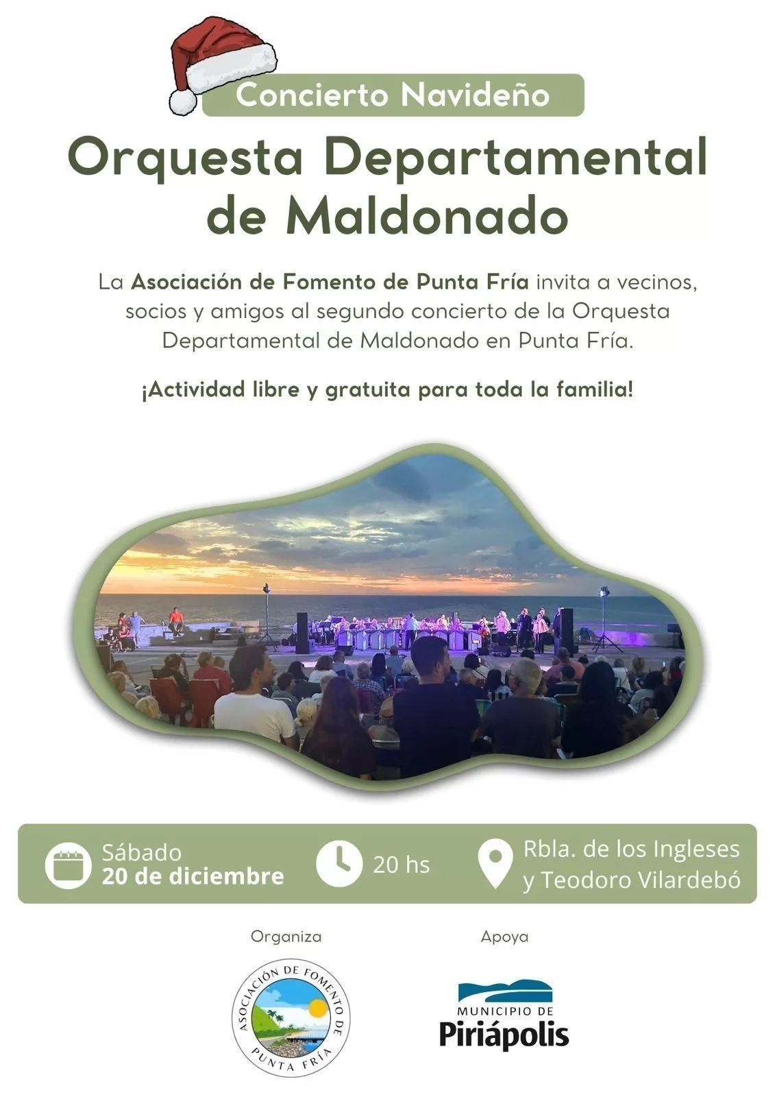 Punta Fría anuncia el Concierto Navideño de la Orquesta Departamental de Maldonado; sábado 20 de diciembre. La Asociación Fomento de Punta Fría invita a vecinos, socios y amigos al Concierto Navideño de la Orquesta Departamental de Maldonado, que se realizará el sábado 20 de diciembre a las 20:00 horas, en la intersección de Rambla de los Ingleses y Teodoro Vilardebó, en Punta Fría.