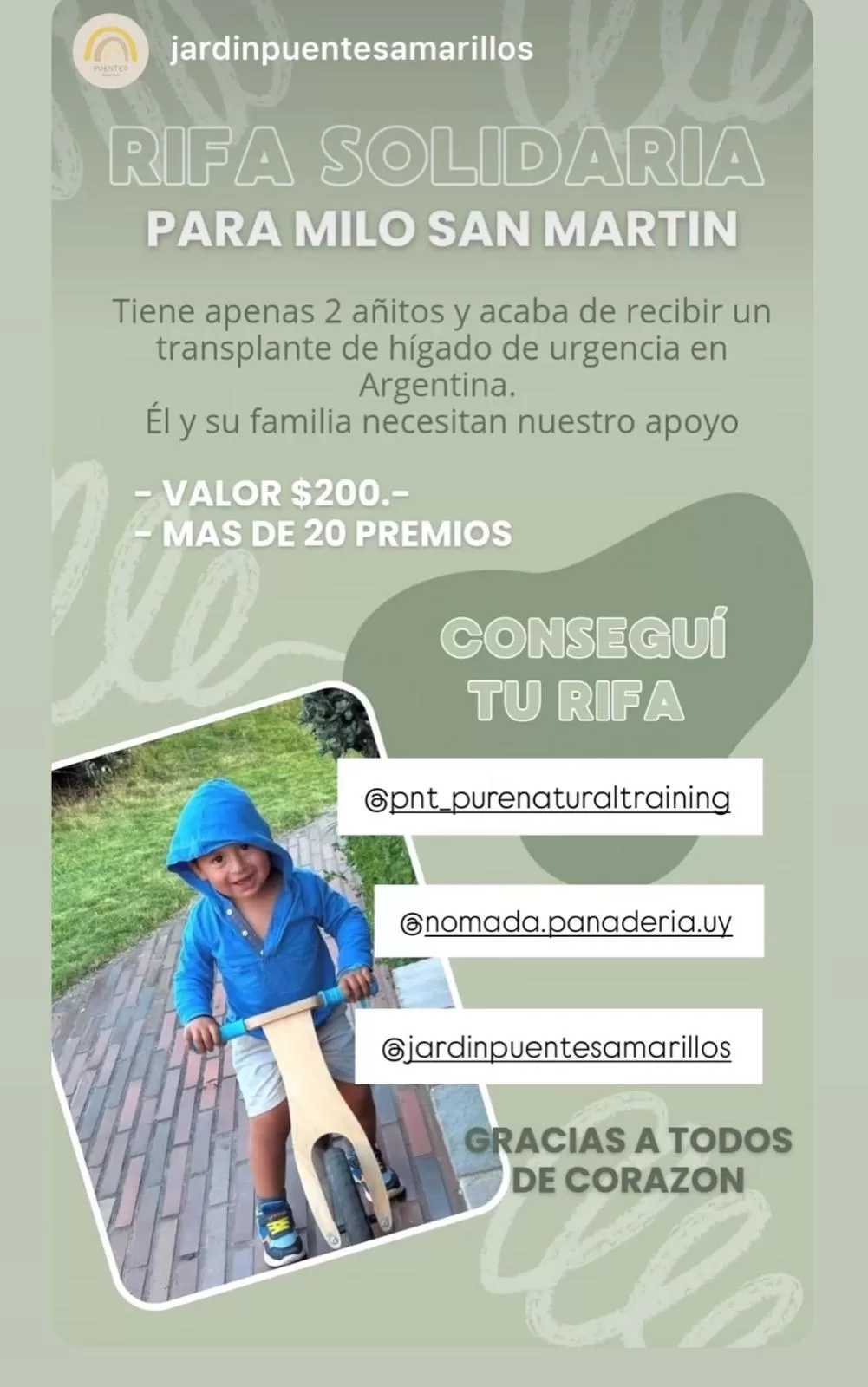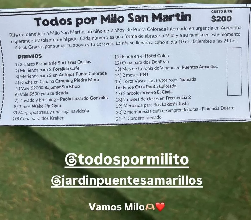 Ante esta realidad, familiares, amigos y vecinos han puesto en marcha rifas y campañas solidarias para colaborar con los costos que implica la internación y el tratamiento. Una de las iniciativas más recientes es la Rifa Solidaria a beneficio de Milo, que sorteará dos camisetas oficiales de Nacional y Peñarol. El número tiene un costo de $150 y el sorteo se realizará el 15 de diciembre. Para adquirir números, se puede contactar a los teléfonos 099412803 y 095515716. La actividad cuenta con el apoyo del jardín Puentes Amarillo