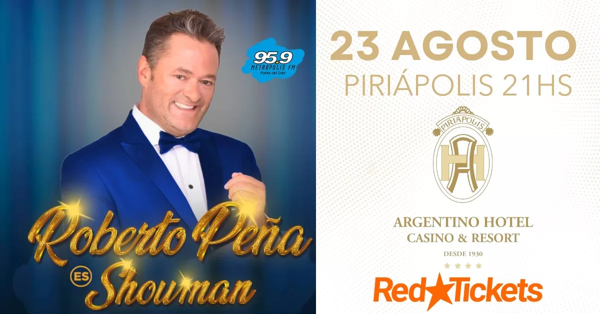 Roberto Peña llega a Piriápolis con su espectáculo «Showman» y un gran elenco! Viernes 23 de agosto Informes 094 622 011. Entradas en Redtickets y Redpagos. Llega a la ciudad Roberto Peña con su espectáculo «Showman» Nos mostrará una infinidad de personajes cómo por ejemplo Ricardo Arjona, Silvio Soldan, Ricky Martin, Michael Jackson, Diego Torres, Homero Simpson, entre otros; momentos desopilantes de humor; cuadros musicales impactantes con grandes bailarines y una cantante encantadora.