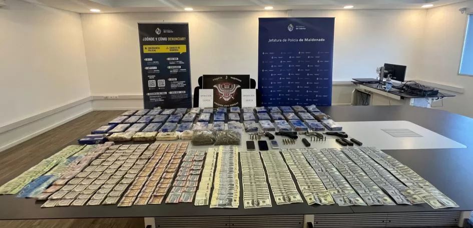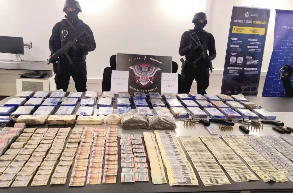 San Carlos: Policía desarticuló red de narcotráfico incautando 50 kilos de drogas ilegales, armas, vehículos y dinero; tres condenados. La Policía de Maldonado desarticuló una red de narcotráfico en San Carlos con significativas incautaciones. Mediante la operación «Santa» se incautaron 52,009 kg de estupefacientes, dos revólveres con 14 cartuchos, dos pistolas 9mm con 4 cargadores y 15 cartuchos, además de la suma de dinero en efectivo de US$ 21.446 y $361.000, 4 vehículos y se detuvieron a 4 personas, entre ellas una mujer. Este jueves, declararon en la sede penal, resultando condenados tres sujetos.