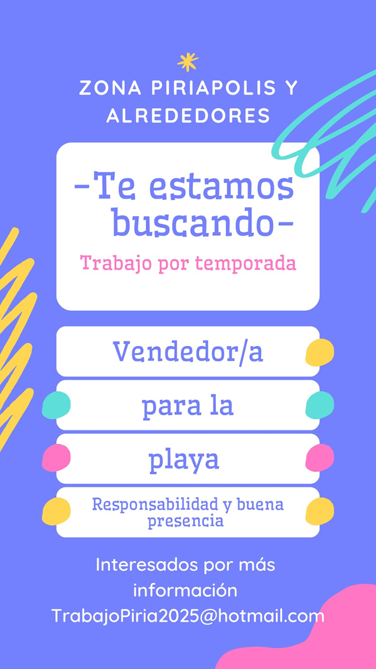 Se busca vendedor/a ambulante en zona Piriapolis o alrededores. Requisitos: ser mayor de 18 años, disponibilidad horaria. Enviar CV al mail: [email protected]