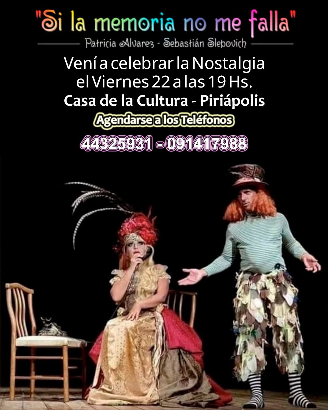 El próximo viernes 22, a las 19:00 horas, la Casa de la Cultura será escenario de una propuesta escénica, presenta una serie de personajes disparatados pero cercanos a la realidad, con el objetivo de hacer reír al público de sí mismo. El espectáculo se describe como una comedia única. “Si la memoria no me falla”, el espectáculo contará con la participación de Patricia Álvarez y Sebastián Slepojvich.