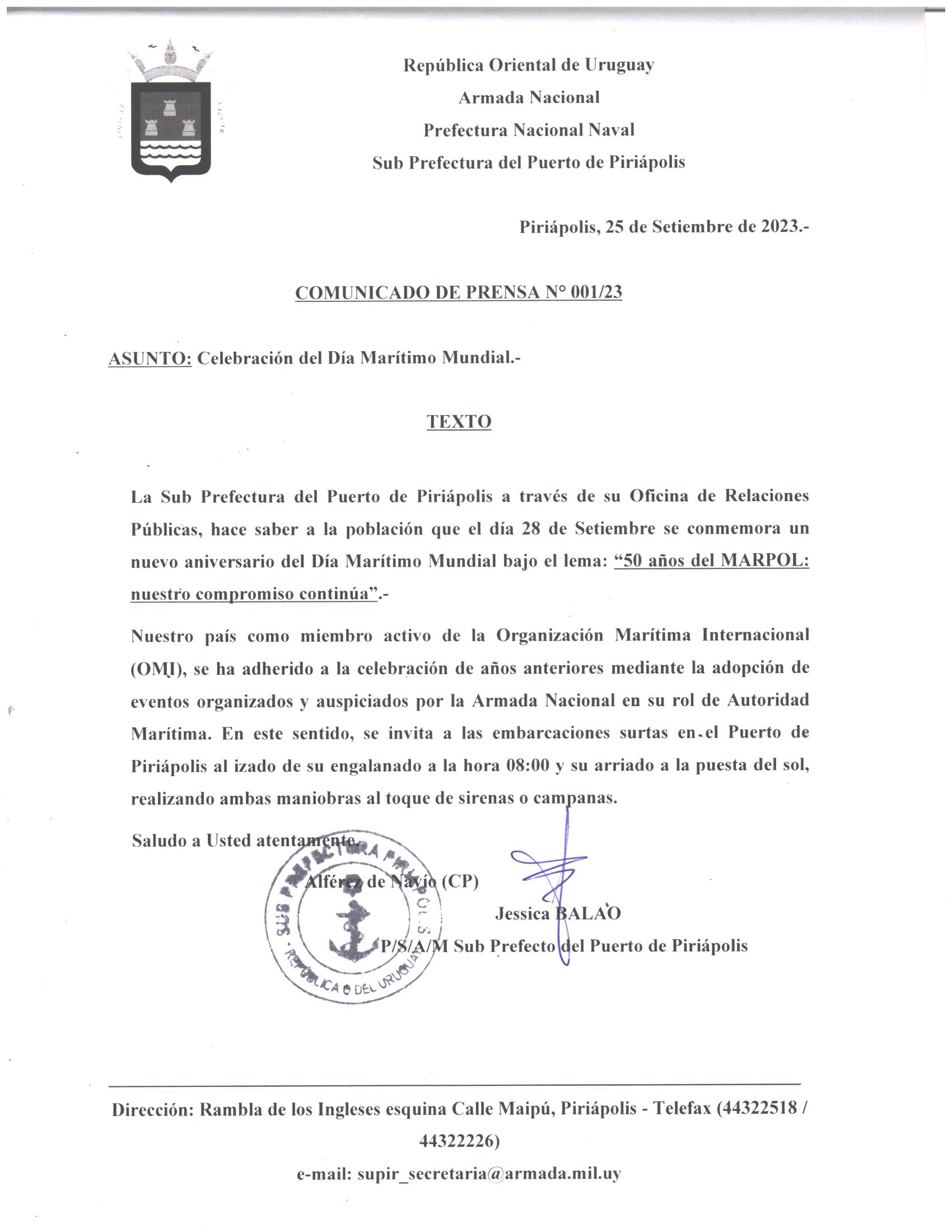 Como miembro de la Organización Marítima Internacional (OMI), nuestro país adhiere anualmente a la celebración del “Día Marítimo Mundial”, fijada la celebración para el día 28 de setiembre. Los actos centrales se desarrollaron en la Escuela Naval con la presencia de Autoridades Nacionales e integrantes del sector marítimo.