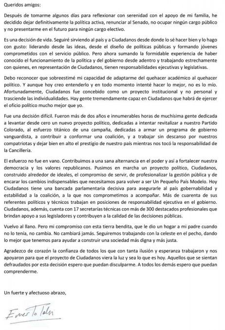 Talvi presentó su renuncia a la Cancillería el pasado 1 de julio, en una carta en la que afirmaba que su intención era seguir hasta fin de año en el cargo. “Comprendo, sin embargo, que los tiempos en el gabinete los marca el presidente de la República”, agregaba Talvi a la hora de renunciar. Solicitó licencia antes de retornar al Senado, pero este domingo difundió la carta con su renuncia a la actividad política.