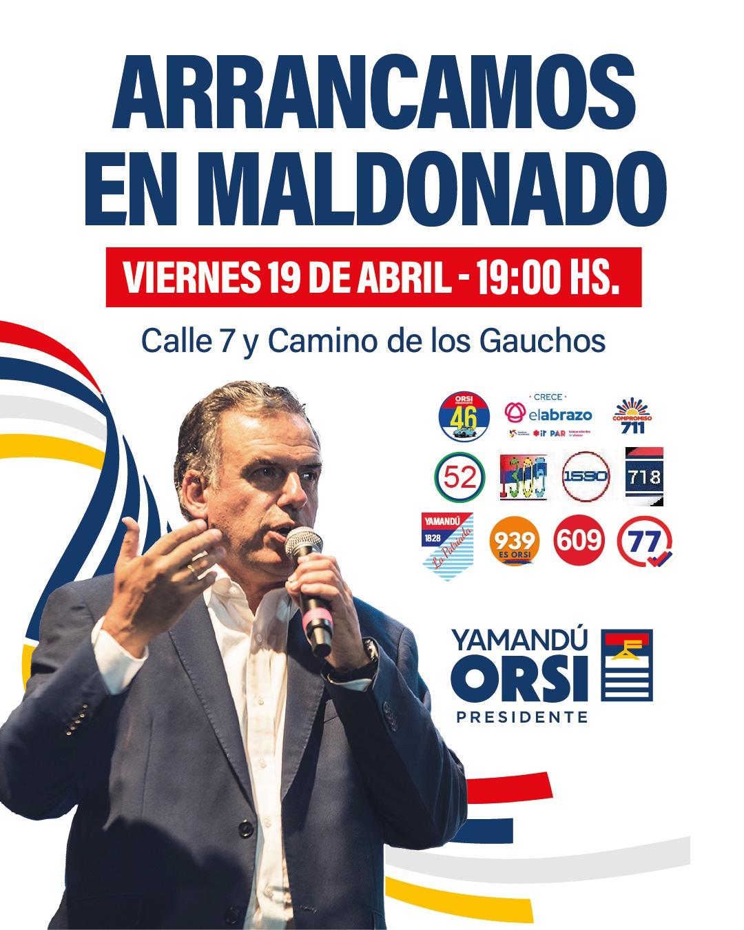 Yamandú Orsi lanza campaña en Maldonado; este viernes hora 19:00. El Frente Amplio informa que el precandiato Yamandú Orsi estará este viernes en Maldonado, lanzando la campaña política en el departamento de cara a las elecciones internas de junio. El acto será este viernes, 19 de abril de 2024, a la hora 19:00. en calle 7 y Camino de los Gauchos, en la capital fernandina.